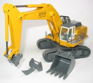 1:50th Scale Liebherr R984C Backhoe Excavator with Ripper Presented here is the long awaited Liebherr R984C tracked excavator with quick coupler, rock bucket and ripper tooth from Conrad. This is a new version which has a cab roof protection screen and yellow and grey colour scheme. The metal tracks have triple grouser pads and rotate freely on the track frames. The upper body has side cast walkways with realistically textured metal panels with sturdy railings around the cab access platform.