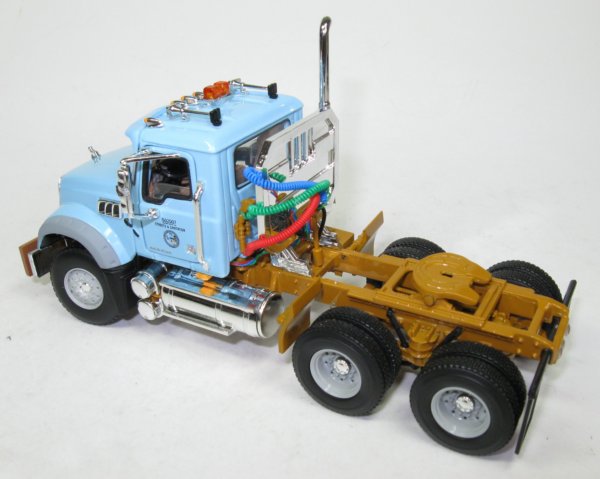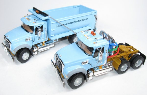 Presented here is the Chicago liveried Mack Granite tractor with Talbert trailer in 1:50th scale from First Gear. The three axle tractor features opening engine compartment revealing a fully detailed engine block and associated components. The cab interior is visible through the clear windows and opening side doors and has an amazing level of interior detail.
