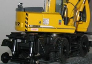 The outriggers operate and the rail wheels can be raised or lowered. The steering is functional and the tread pattern on the tyres is different on the outer wheels like the real machine.
