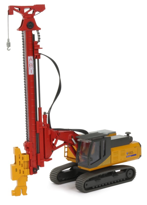 The top of the mast has a crane jib which rotates through 360 degrees but does not have a functioning cable, so there is a short length of rope attached to a hook. The paintwork is excellent with a distinctive yellow and red colour scheme of the Krupp company. Silver panels with textured diamond plate pattern are fitted to the upper body and the Krupp markings have been added across the rear of the counterweight and engine sides. This is a great update to the original model and an accessory kit is also available which consists of auger drill with motor and a multihead piling attachment .