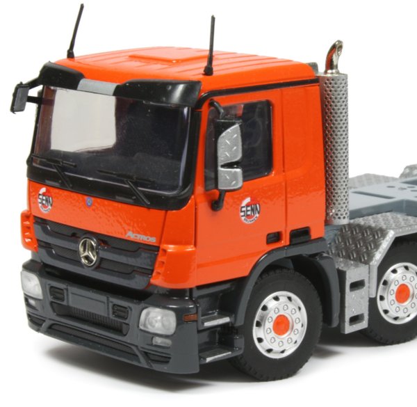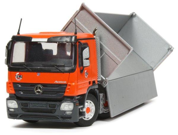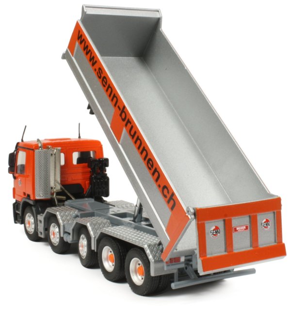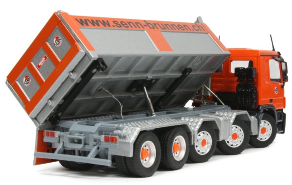 Presented here is the 1:50th scale Mercedes-Benz MP3 5-axle chassis with Moser 2-way tipping body decorated in the Senn-Brunnen company colours from Conrad. With a load capacity of 17 cubic metres (23 ton), the truck has a fully laden weight of 40t and is one of a number of vehicles in the Senn-Brunnen fleet. For further details, check out their website.