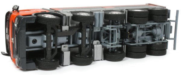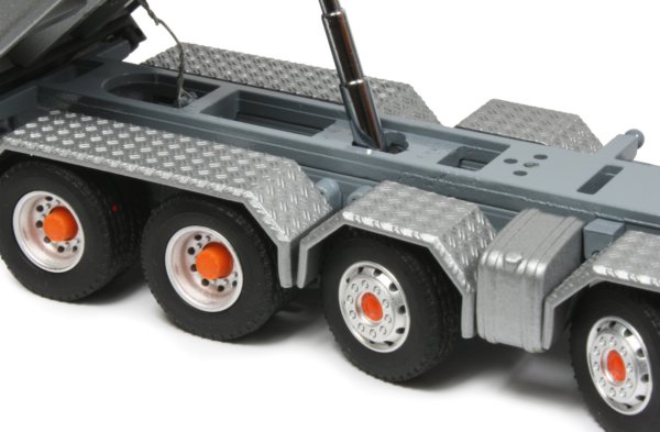 The main chassis is configured in 10x4 configuration with a central steering tag axle which can be raised off the ground. The front axles have linked steering with the rear-most pair of axles having suspension frame detailing with the axles floating to simulate working suspension. The wheel hubs are very nicely done with plenty of cast detailing and orange centres with authentically treaded rubber tyres.