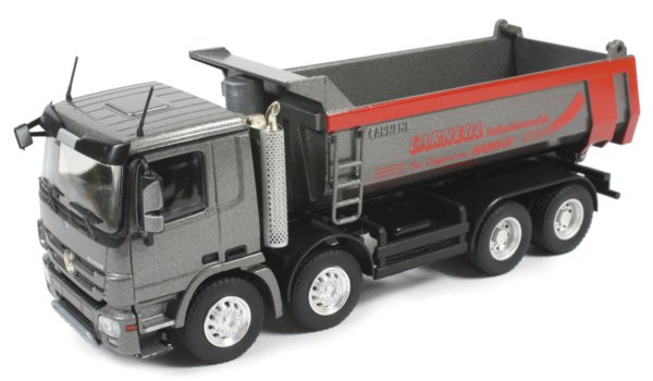 Presented here is the 1:50th scale Mercedes Benz Actros MP3 8x4 with Carnehl tipping body from Conrad. The roof has two holes where the flexible plastic aerials need fitting while holes in the cab frame allow the rear view mirrors to be easily fitted.