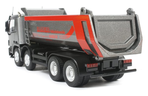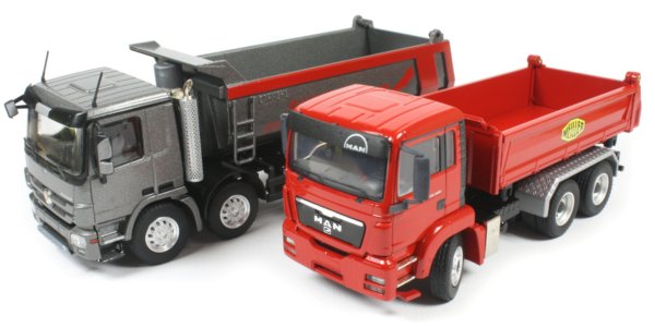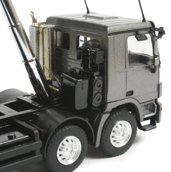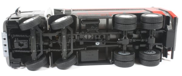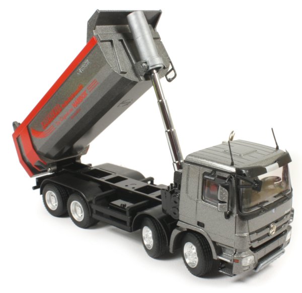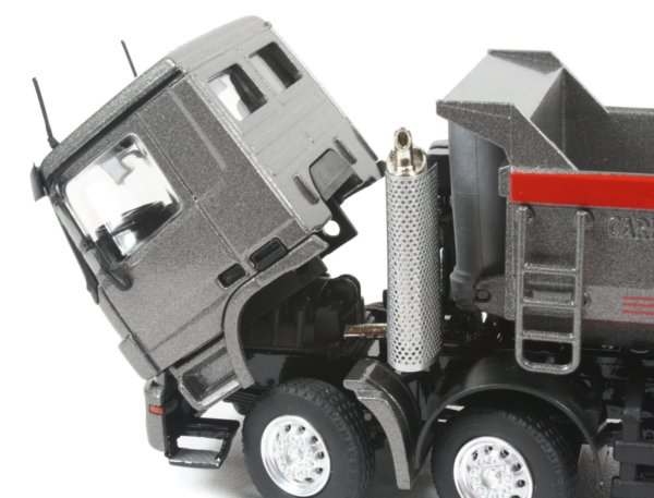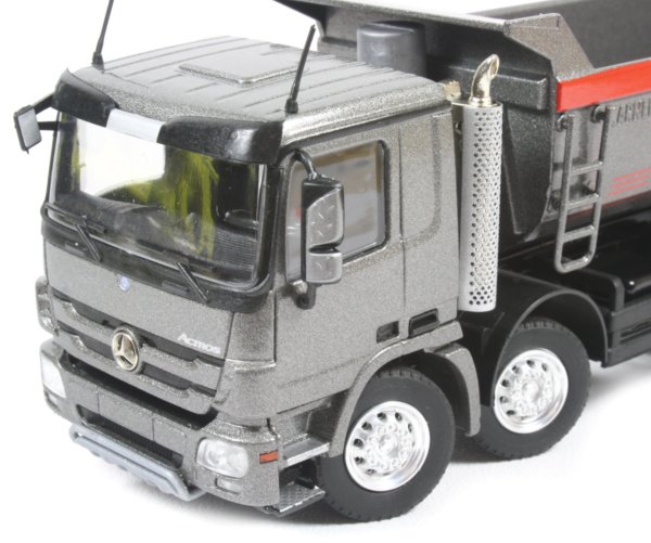 The cab doors have handle detail cast into the surface and highlighted with black for added effect with silver highlighted access steps leading up to the cab. The sun visor fitted above the windscreen has a central chromed section, a highlight of the new cab aesthetics and the interior has been replicated with the moulded dashboard and ridged seats clearly visible. The cab features a new casting with crisply modelled grills and the chromed Mercedes logo is prominently displayed centrally. Integrated driving lights with clear plastic lenses have been added to the bumper with small amber indicator lights on the corners whilst a protective plate has been fitted to the lower edge of the bumper panel. The hydraulic fluid tank for the tipping cylinder is fixed behind the cab with the multi-stage hydraulic piston allowing the body to tilt to a reasonable angle. The rear tailgate pivots open to discharge material and the body has a curved floor to assist in full discharge of the load, just like the full sized truck. The cab tilts forward to uncover the metal engine block mounted to the chassis and the large chromed exhaust stack has an intricate photo-etched cooling jacket which looks very authentic with a metal frame on the opposite side of the chassis. The front axles have working steering and are fitted with accurately moulded rubber tyres which have a detailed road tread pattern along with silver wheel hubs. The rear axles are mounted to the chassis with simulated and non-functional leaf spring suspension which keep the axles rigid. A drive shaft is connected between the rear axle hubs and to the front transmission block.