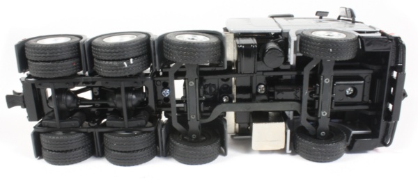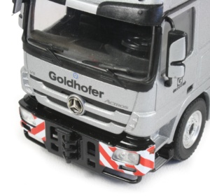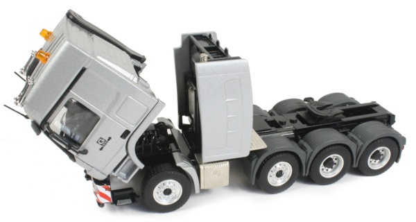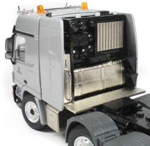 The Actros MP3 cab has been nicely captured with crisp body panel detailing and roof mounted window with chromed air horns and amber beacons. The front detailing of the cab and grill has been accurately produced with the tilting cab revealing the engine block at the heart of the chassis.