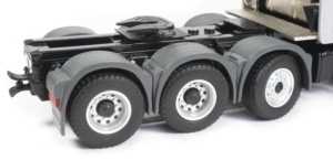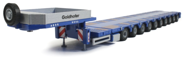 Presented here is the 1:50th scale Mercedes Benz Actros MP3 8x4 prime mover with Goldhofer STZ-H10 10-axle semi trailer from Conrad. The STZ range of semi-trailers are flexible and sturdy, designed for a diverse range of applications from general logistics to construction and mining industries. The rear trailer chassis houses ten axle lines with eight of them featuring functional steering.