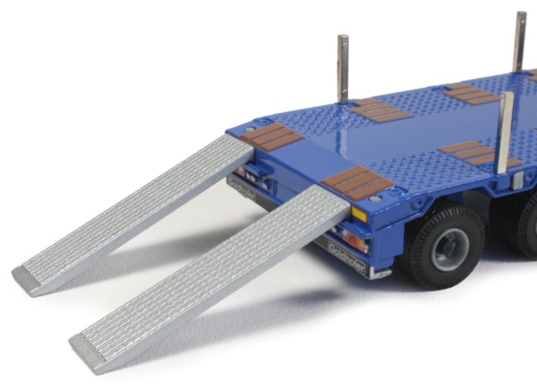 Removable metal ramps are also supplied which locate into the groove along the rear edge of the trailer during use and, when not needed, slide into the storage compartment mounted under the trailer bed which has opening doors on both sides. The trailer has four extending stabilisers, two at the front and two at the rear to keep the trailer sturdy during loading/unloading. A number of metal poles are supplied with the model and push fit into the holes along the top edges of the deck.