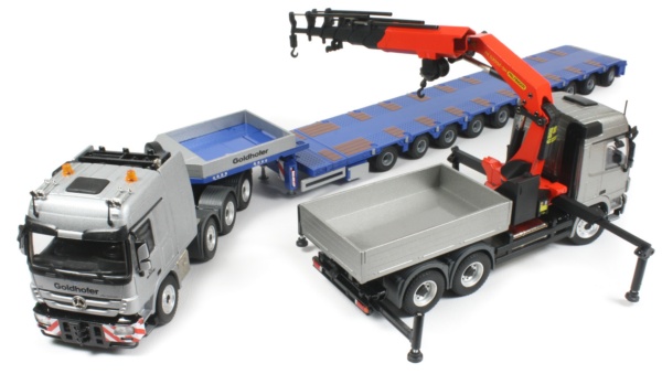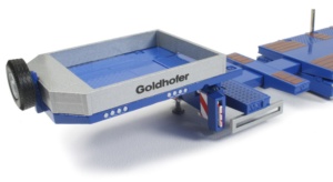 The model is packaged in a sturdy cardboard box with opening top using a shaped foam inner to securely hold the model in place. As expected from Conrad, the paint finish is excellent with crisp decal printing throughout. This is another good addition to the Goldhofer model range and looks great alongside the Actros 6x4 with Palfinger PK53002 crane.