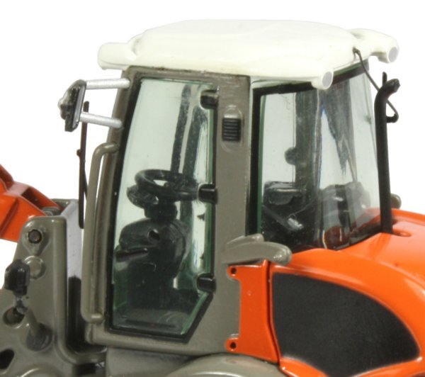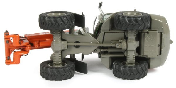 The underside has a drive-shaft to the front axle with articulating steering powered by a single hydraulic. The axles have good surface detailing with ridge treaded rubber tyres fitted to the grey hubs which themselves have good replication of the bolt heads.
