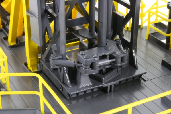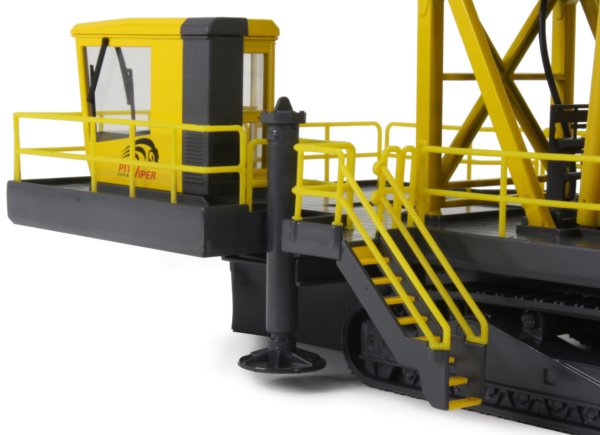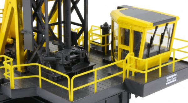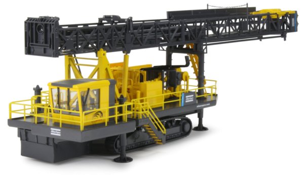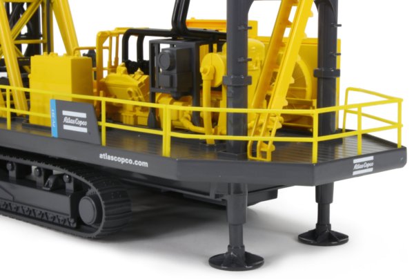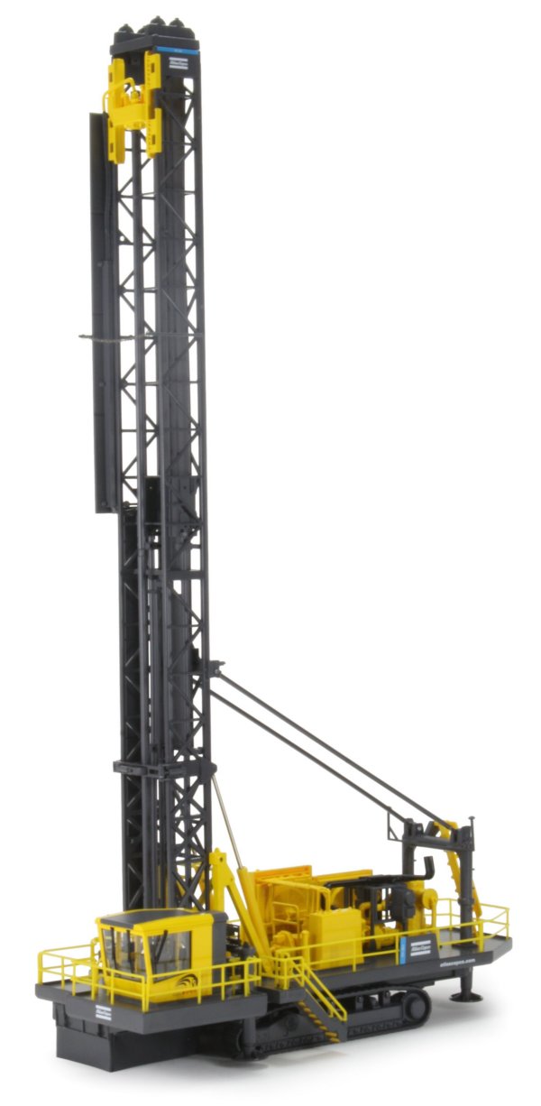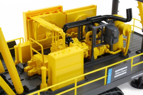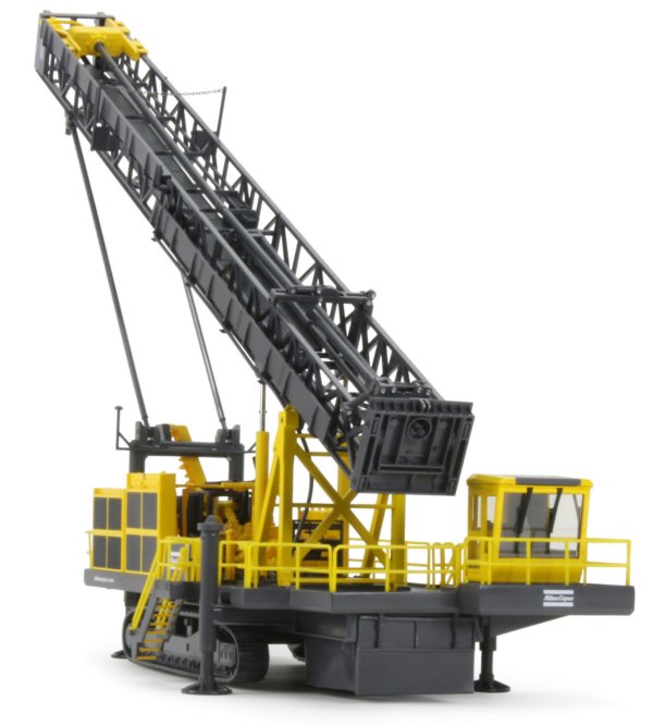 Atlas Copco Pit Viper PV351 Blast Hole DrillThe Atlas Copco Pit Viper Series PV-351 is the flagship machine for the drilling of holes in hard rock with a diameter between 207mm and 406mm to a depth of 19.8 metres in a single pass and drilling to a total depth of 41 metres using multi-pass drilling with a drill rod carousel. The rotary head has a torque of up to 25.7 kNm and the onboard compressor has a capacity of 107.6 cubic metres of air per minute at a pressure of 7.6 bar. The onboard RCS (Rig Control System) provides automation capability for increased productivity and the live tower can be raised with a full carousel with the rotary head at the top of the tower. Weighing in at around 180 ton, the machine is powered by either a Caterpillar 3512 engine rated at 1650hp or a Cummins QSK45 engine at 1500hp. The 1:50th scale model has been produced in China with many of the components produced in die-cast metal with plastic parts used for added detail. The undercarriage is fairly basic and fitted with rubber band style tracks which do have some moulded surface detail but to today’s standard, it is a little disappointing that they are not individually linked. The main chassis frame is metal with a metal tower, support frame and cabin. All the safety railings running around the edge of the structure are plastic, as are the access stairways and detailing parts of the tower. The large cabin has a simply modelled interior highlighting the operator station facing the drill head with a raised monitor panel and controls. The four large hydraulic jacks can be lowered and have a smooth inner surface with the screw thread hidden, extending enough to raise the tracks off the ground. The model depicts the diesel version with the main engine block clearly visible along with the various exhaust outlets and coolant piping leading to the two large radiator modules which have a patterned texture on the outside with fan blade detailing on the inside surfaces. The compressor tank is also modelled along with the control cabinets and other components on the rear deck. The tower can be positioned in the lowered travel position or raised to the drilling position with a fitted drill rod, complete with drill bit already connected to the rotary head which is in turn connected to a sliding frame which can be adjusted on the tower. The carousel is also modelled with operating rod handling arms at the bottom and higher up the frame which adds extra realism. Flexible rubber skirts are fitted below the drill deck to prevent debris being thrown which is a nice addition and the paint finish is of a good standard with a close colour match between metal and plastic parts. The Atlas Copco markings are authentically placed and round out a rather nice and impressive model, touching over 640mm in height with the mast raised. |