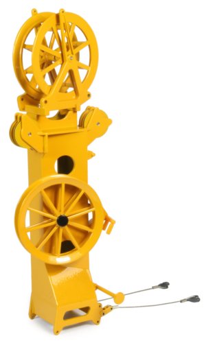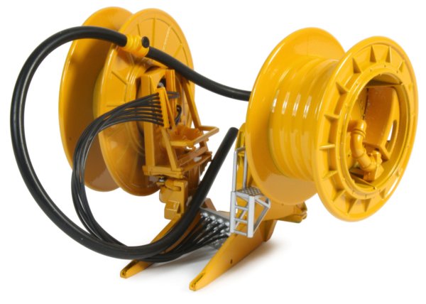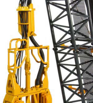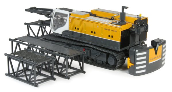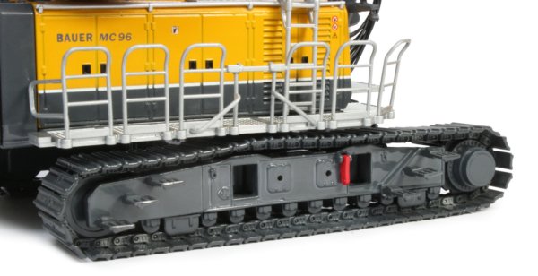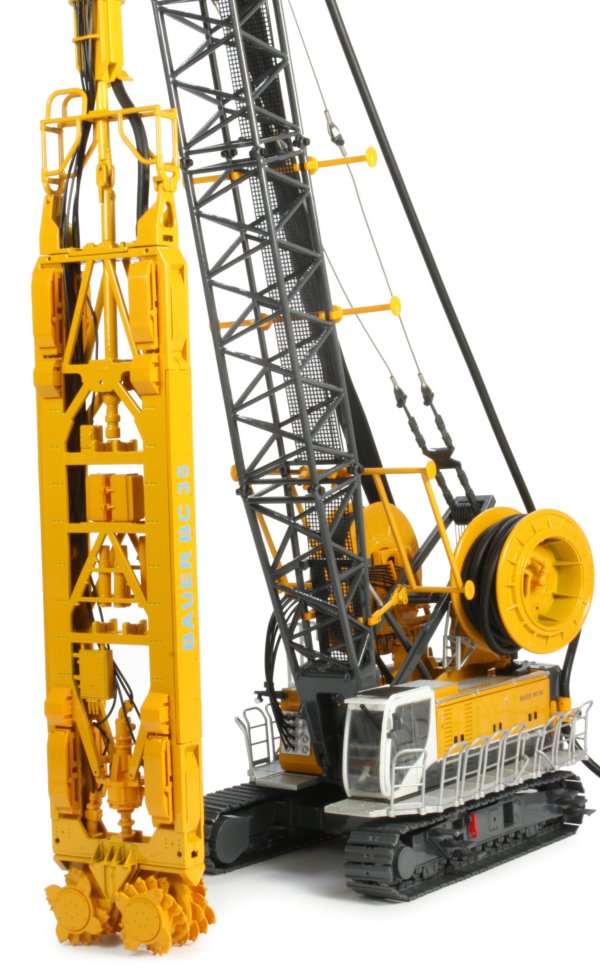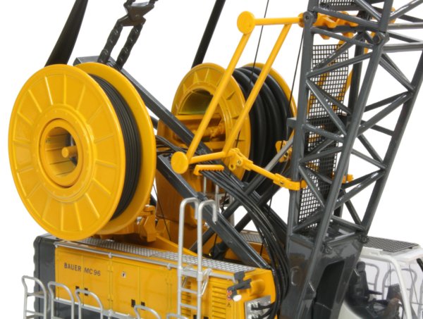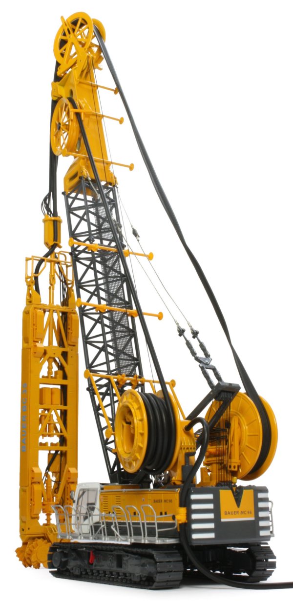 Bauer MC96 Duty Cycle Crane with HDS-T System and BC35 Trench CutterIn 2014, Bymo released the first version of the MC96 duty cycle crawler crane which came with the BC35 trench cutter and HTS60 hose tensioning system. Bymo has now followed up with a new derivative of the equipment which still uses the MC96 as the carrier but this time, the HDS-T system is modelled. The 1:50th scale model from Bymo has been produced to allow several different configurations to be realised out of the box including a standard lifting configuration. True to the original, the model comes in a stripped down configuration allowing it to be posed on a low loader for transport. It would have been easy for Bymo just to reproduce the MC96 using the same tooling and yet, they have taken the opportunity to update the model with changes to the outside of the track frames to incorporate twelve access steps while the side platforms with metal safety railings are now a different layout without the steps at the rear. Another small difference is the exhaust stack which is larger. The undercarriage is still extending to provide a stable base and the side panel can be detached to uncover the winch holes and winders. Unfortunately, the winches themselves are the same as the previous version and there is no brake on the lines, so it is not possible to have them set up holding any weight. The HDS-T system allows the digging of trenches to a depth of 120 metres and for this, the mud hose and hydraulic bundle are stored on rotating drums mounted to the upper body of the carrier which rotate to lower the BC35 trench cutter as it is lowered into the trench.