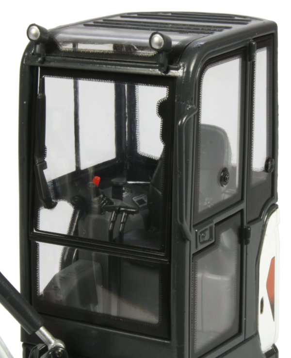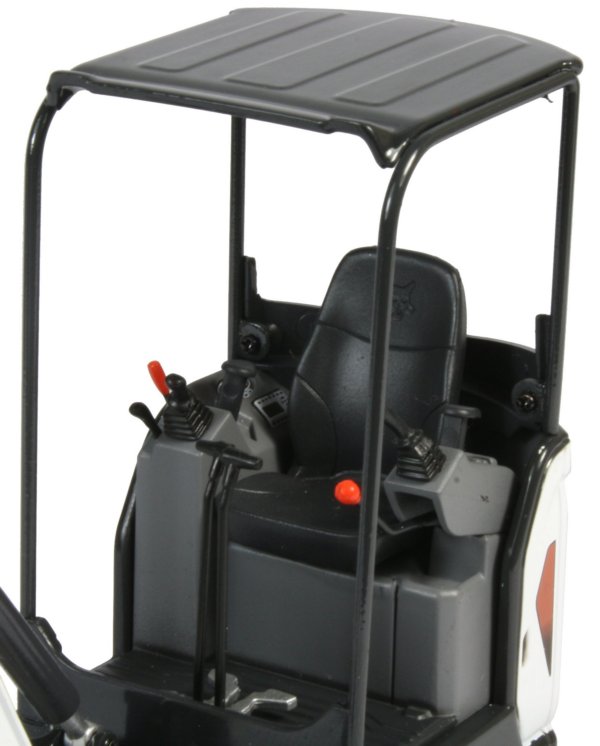 On the canopy version, the interior is more visible with all the various controls modelled, including the safety levers with the Bobcat logo embossed on the seat.