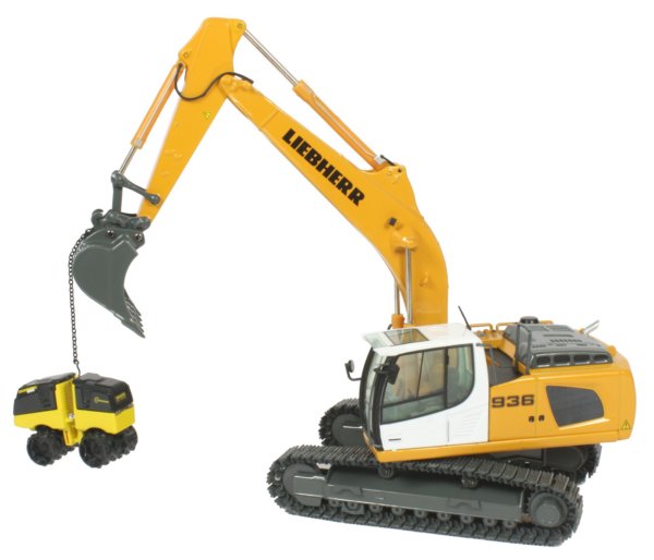 The paint finish is excellent with the casting details visible throughout. The printing of the Bomag name and designations are surprisingly crisp considering their small size. While the model is rather expensive considering the small dimensions, the amount of detail found on the model shows that a lot of work has gone into it's production. The central integrating lifting bracked can be used to lift the compactor, as pictured below being handled by the Liebherr R936C.