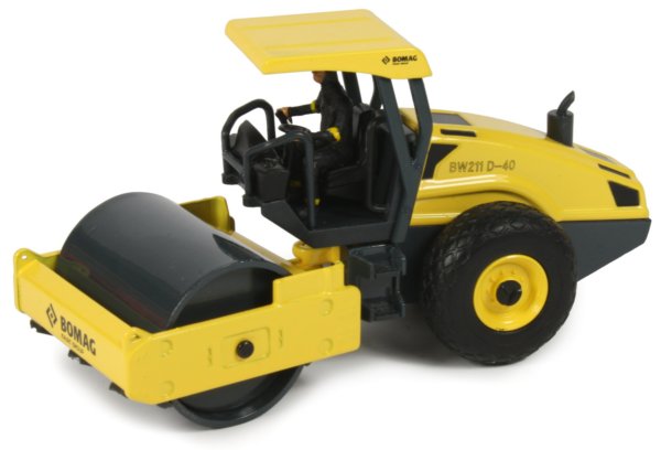 Presented here is the 1:50th scale Bomag BW211 D-40 single drum compactor which has been produced in China for Bomag. The model features a smmoth rolling drum and an open ROPs canopy with seated driver which is a novel addition, although the detailing of the figure is a little lacking and the dark clothing doesn't help.