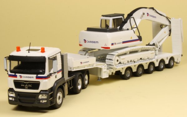 The paint finish is of a high quality, as expected from Conrad while the Cardem graphics are authentically applied. The model is pictured below in transport on the rear deck of the Doll 5-axle trailer with 3-axle MAN TGS tractor unit which is also finished in the Cardem colours.