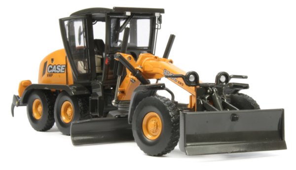 Case 856C Motor GraderPresented here is the 1:50th scale Case 856C motor grader which has been produced by Motorart and first launchedat the Intermat exhibition in Paris with the tooling based on the New Holland F156.7 grader with a new rear body casting and updated paint and graphics package. There are no noticeable casting differences on the cabin, so there is still the imbalance of only half the safety railings on the cabin frame being replicated. The interior has a coloured finish with opening side doors allowing more of the interior highlights to be seen including the driver seating and central console with steering wheel. The exterior of the cabin has thin scale grab rails fittd to the frames with screen wipers added to the front and rear windows while the roof line has silver painted lights front and back. Red painted side markers have also been added which is a nice touch. The opening rear bonnet is a different casting to the F156 with smooth sides and a relocated exhaust port with the exhaust silencer reversed and finished in silver. Here again, thin scale metal grab rails have been fitted which add to the realism. The front wheels have steering and angular adjustment which works quite well, with the rear bogies offering oscillation, all finished with treaded tyres and painted wheel hubs. The Case colours do look good with accurate placement of the markings on the sides of the body and frame. The ripper operates, the front blade is height adjustable and the main blade can be rotated and raised. |