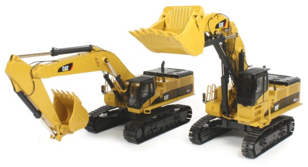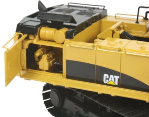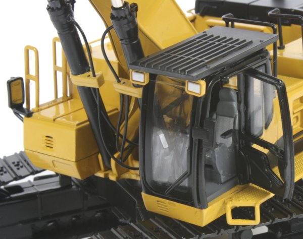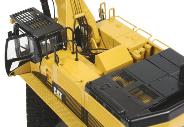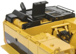 The track pads installed on the undercarriage are wider than those fitted to the 385C shovel version with raised fixing bolt heads visible on each pad and tensioned idler wheels keeping the tracks taut. The paint finish is excellent with an even coating allowing the fine casting details to show through while the printing of the Caterpillar markings are very crisp. The model is pictured below alongside the 385C FS tracked shovel.