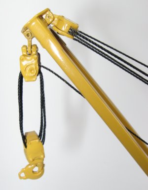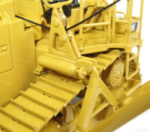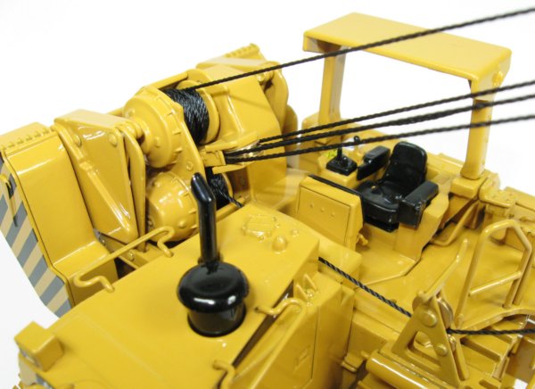 The side mounted counterweight can be extended outwards which gives better stability and also gives access to the winches which are covered when the weights are up against the chassis. The paint finish on the model is very good with an even paint coating and good printing of the black chevrons and Caterpillar markings.