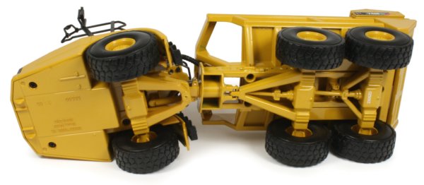 The underside of the chassis shows the suspension and drive-train details with some oscillation movement to simulate the suspension. The articulating joint is a tight fit with rotational movement allowing the model to be placed on an uneven surface. The rubber tyres have an accurate tread pattern moulded into them with plastic wheel hubs highlighting the small fixing bolt detailing. The paint finish is very good throughout with accurate placement of the Caterpillar markings and machine designation. |