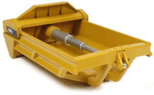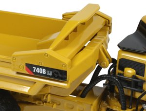Caterpillar 740B EJ Articulated Dump Truck Presented here is the Caterpillar 740B EJ articulated dumptruck in 1:50th scale from Norscot. It has been modelled with an ejecting body and folding tailgate rather than the more standard tipping body version which is a nice change. Detail level is high with some nice features like the silver finished steps leading up to the cabin on both sides of the chassis with safety railings and integrated rear view mirrors fitted although these are plastic and easily bend out of shape which is a little of a shame. The cabin interior has been modelled with a grey colour allowing the curved dashboard and steering wheel to be seen. The rear cooling housing has black highlighted grills inset into the casting with a fine textured surface, topped with a plastic rear window guard.