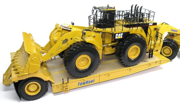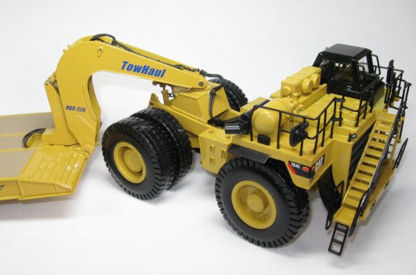 Presented here is the 1:50th scale Caterpillar 784C prime mover with Towhaul RGS-225 lowboy trailer. The first towhaul trailer was produced in 1990 and today, the trailer is in use in mines throughout the world. The unique design of the gooseneck allows connecting / disconnecting of the trailer in about 90 seconds thanks to the grab hook design, even if the ground is not level. The RGS-225 has a capacity to transport machinery up to 250 tons in weight.