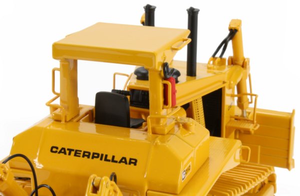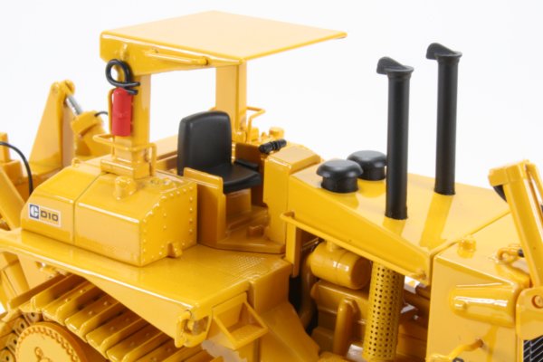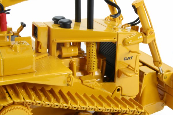 The track frames have raised drive sprockets with plenty of surface detailing of the housings with lower bogies and track tensioners keeping the individually linked tracks taut, while allowing them to rotate smoothly. The main lift cylinders for the straight push blade are mounted to the front frame of the engine bay with flexible hydraulic lines disappearing into the engine bay.