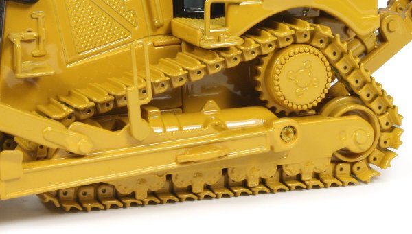 The model is visually an improvement over their previous dozer models in my opinion with added levels of detail, like the safety railings and platform access to the filler cap on the left side of the upper deck and the grab rails added to the dozer arms for added safety when entering / leaving the machine. Unfortunately, these are plastic and flexible which is a slight dissapointment. The undercarriage is rigid with track frames that house linked metal tracks which are tensioned and rotate smoothly. The main sprocket wheel has good surface detailing of the final drive housing with the lower roller detailing integrated into the frame casting. Quality control is missing here, as the tracks have been fitted backwards on the sample reviewed.