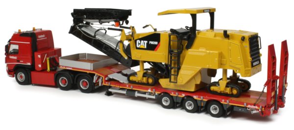 The paint finish on the model is of a good standard with authentic printing of the Cat logos. Fine details include authentically scaled grab railings and light housings although these unfortunately do not have painted lenses. The model is posed below on the Nooteboom 3-axle semi low-loader trailer and makes a convincing load.