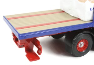 The graphic printing all around the cab is very crisply done, with intricate artwork on the side windows highlighted with silver text printed above the cab doors, across the sun visor and centrally on the rear panel of the cab with the Larkins name printed down the sides of the rear streamlining panel. The large opening bonnet, which remains in the opened position on it's own, reveals a moulded engine block at the heart of the engine compartment with an accurately replicated bulkhead.