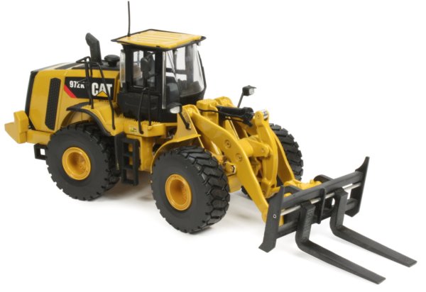 1:50th scale construction form with fusion coupler to fit the range of Caterpillar 950K, 966K and 972K wheel loaders from Tonkin Replicas. Features pitch adjustable forks and direct pin connection to the Fusion coupler by removing the bucket