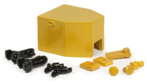 The set is constructed of wooden shipping crates of different sizes, all finely printed with shipping information along with tiny printed labels and authentic coverings. This is one of two accessory sets to depict an authentic transport configuration of the Caterpillar D11 dozer