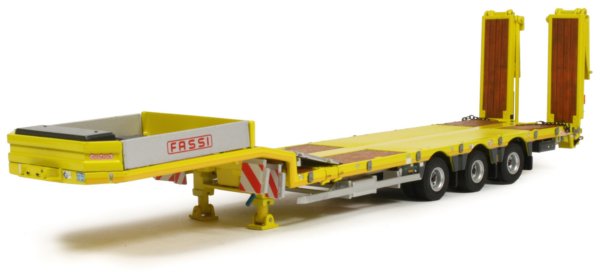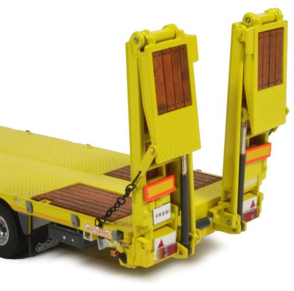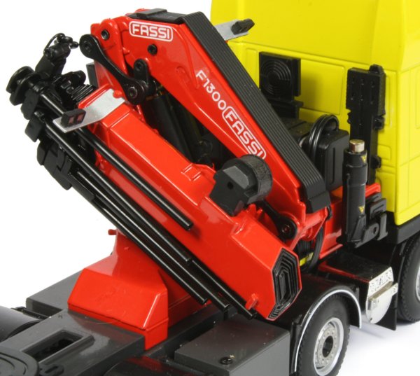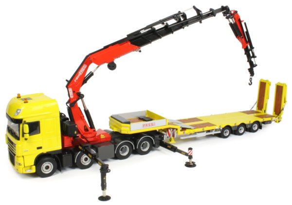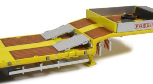 This version also comes with a 3-axle Nooteboom OSDS-48-03V semi low loader trailer with hydraulic ramps for a very impressive heavy haulage replica. The raised front deck of the trailer has a number of holes where the various parts can be connected. The two side sections are printed with the Fassi name and the rear section can be omitted, allowing the upper deck to be used as a storage area or as extra deck space depending on the load being carried.