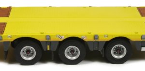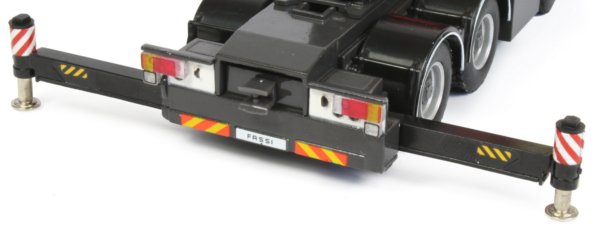 The tyres have an accurate tread pattern moulded into them and are fitted to silver coloured wheel hubs. Pull out safety boards with a red and white chevron pattern are fitted beneath the deck and slide out smoothly whilst two separate safety panels are supplied which fit into the holes at the rear of the trailer to warn of extra wide loads. These are also stored in holders integrated into the gooseneck at the front of the trailer.