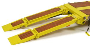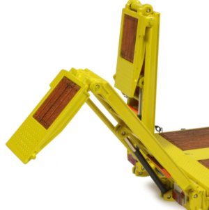 Fold down rear stabilisers help to keep the trailer level during loading operations and this is functional on the model. The main loading ramps are modelled on the folding 5 foot design and this mechanism has been authentically engineered on the model with a metal bar operating to unfold the ramp as the hydraulic lowers. Safety locking chains are included and connect with the pin cast into the outer side of the ramp.
