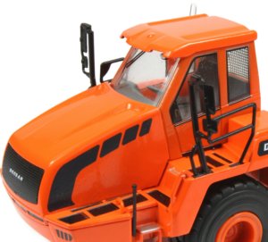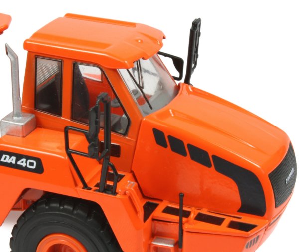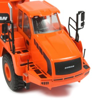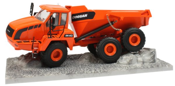 Doosan DA40 Articulated Dump TruckPresented here is the 1:50th scale Doosan DA40 articulated dump truck from Clover World. Doosan models have previously been produced in the larger 1:40th scale so it is refreshing that the latest releases have been produced in the more recognised 1:50th scale. The Doosan DA40 has an 18 cubic metre HB400 tipping body and permanent six-wheel drive which ensures stability for the most demanding job sites. Powered by a Scania DC13 six-cylinder diesel engine offering a power output of 500hp, the sloping rear frame gives better weight distribution with semi-independent hydro-pneumatic front suspension for exceptional traction.