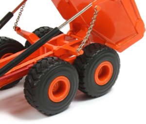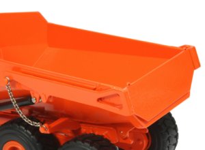 The underside of the chassis is rather plain but there is a drive-shaft to the rear drive housing and hydraulics are fitted between the front and rear chassis offering a fairly good range of steering movement while also allowing rotational movement of the joint. The connection is nice and tight so there is no wobble and the front suspension frame has also been modelled. The rear of the model has a light housing integrated into the dump body with painted brake and reversing lenses added for extra realism. The rubber tyres have an authentic tread pattern and rotate freely, topped with orange wheel hubs. The cabin has been modelled well with flush fitting windows and painted simulated window seals giving the model a more realistic appearance. The interior has been replicated with the driving seat, steering wheel and contoured dashboard all visible within.