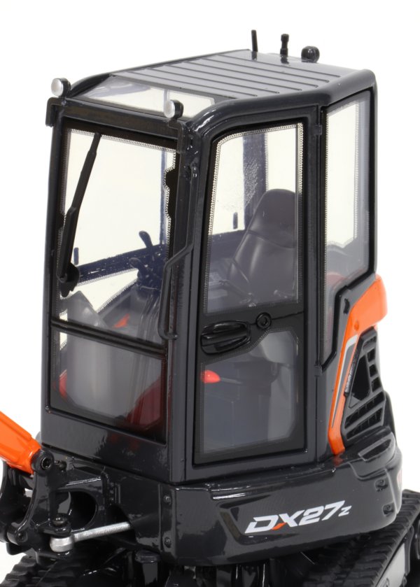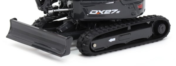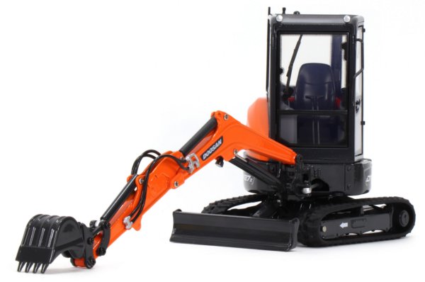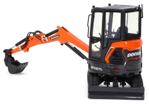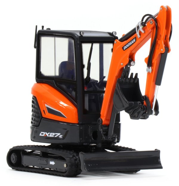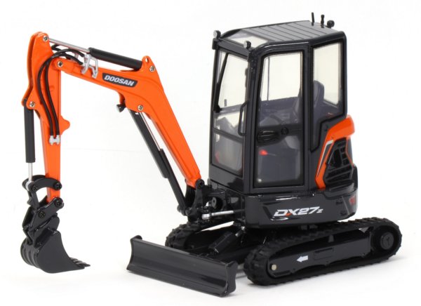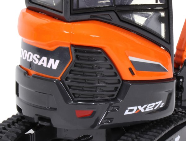 Doosan DX27z Mini Tracked ExcavatorPresented here is the Doosan DX27z mini tracked excavator in 1:25th scale which has been produced by Universal Hobbies. The model is based on the Bobcat E27z and as such, shares the same tooling for the undercarriage, body, cabin and digging equipment, with the exception that the DX27z is not fitted with a thumb attachment and instead, the flexible hydraulic lines are terminated with a silver valve. The DX27z has accurately captured the looks of the full-sized machine with the prominent side grills, curved body shape and fully enclosed cabin.