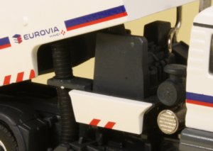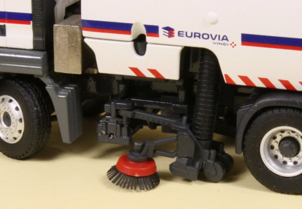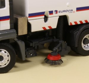 Despite the small dimensions, the 1:50th scale die-cast model from Conrad really packs a punch with some very nicely engineered solutions for the delicate sweeper arm mechanisms. The model has been decorated in the white colours of Eurovia, part of the VINCI Group with the familiar blue and red stripe running along the sides of the body and around the cabin.