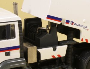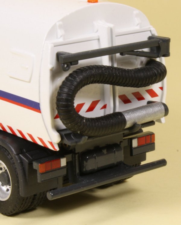 The rear of the model features a wanderhose which is made from a flexible rubber material with a metal end section. Although the support frame is fixed to the rear panel, the hose itself can be detached from the holder to simulate its operation. The sweeper is pictured below alongside the 20' storage container from NZG in Eurovia decoration and a scaled figure from Conrad wearing a Eurovia uniform.