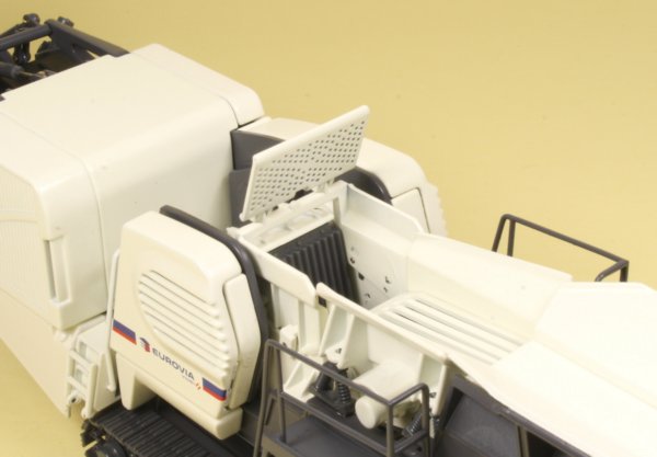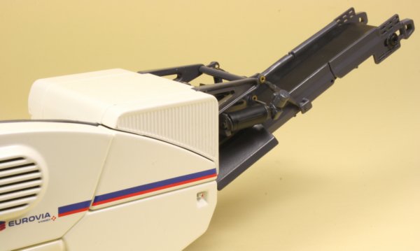The individually linked metal tracks are scaled well and look authentic with triple grouser pads and bolt detailing clearly defined with individually rotating lower support rollers and authentically finished final drive housings and toothed drive wheels. The paint finish is excellent with crisp printing of the Eurovia markings and red and blue stripe.