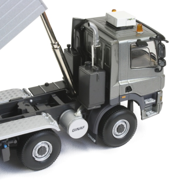 The paint finish is very good, with a metallic grey finish complementing the silver door panels and dark grey chassis frame. The various printed safety panels and logos are all crisp with Ginaf logos added to the mud guards and small printing found on the air conditioning unit.