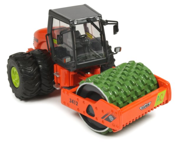 Presented here is the 1:50th scale Hamm 3412 "AGRI" single drum compactor from NZG. The model features additional rear wheels and an updated decoration featuring green wheel hubs, a green finished padfoot drum and green stripe running up the centre of the rear engine compartment.