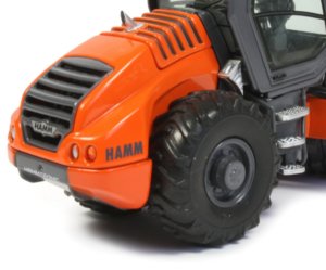 The all metal drum has a hefty weight with an authentically replicated raised drum surface, complete with flexible hydraulic hoses found on both sides of the front frame. The rear tyres have a deep tractor style tread pattern for added grip with nicely modelled wheel hubs. The front frame has bolt detailing cast into the surfaces with a good range of movement of the articulating, hydraulically operated joint between front and rear chassis.