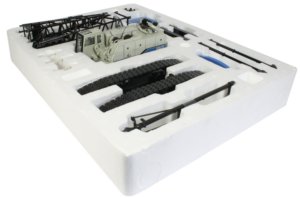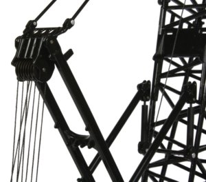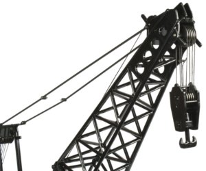 Two main lifting winches are installed and pre-wound with rope with the front-most winch used to operate the hook block which has a five sheaves, again produced as a single piece. Reeving the hook does take a little patience as the rope needs to pass under the small metal guides but once rigged, the hook is fairly heavy and has enough weight to allow it to lower as the winch is operated. The paint finish is of a very high quality and finish with an even coat allowing all the casting detail to be seen. The graphics on the body sides are authentically applied with small safety labels on the counterweight tray and direction arrows found on the track frames. The model is produced primarily of metal and has a nice heavy feel with plastic only used for for small detailing parts like the self fit mirrors, access ladder and the pins used for assembly. The model is now available from the Hitachi Webshop although there are limited quantities available so ordering early is advised. |