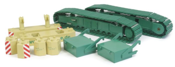 The model is fully configurable with a number of parts supplied in the box. The undercarriage has extending track frames with highly detailed individually linked metal tracks. The idler wheels are sprung loaded to keep the tracks tensioned while the drive sprockets have the Liebherr name cast into the hubs.