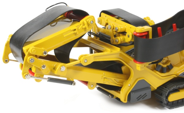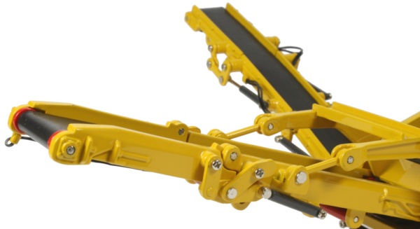 In the folded position, the rubber belts hang realistically, especially on the side conveyor and this adds to the overall level of realism. The linkages on the folding frames are very nicely engineered and the hydraulics are fully operational, allowing each of the conveyors to be set in their working positions, tensioning the belts just enough for them to still rotate freely.