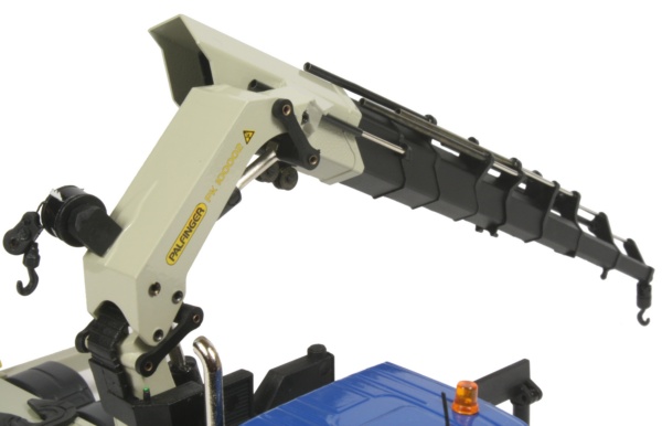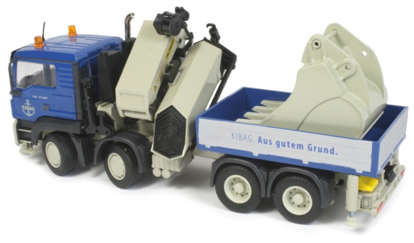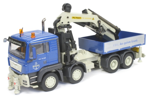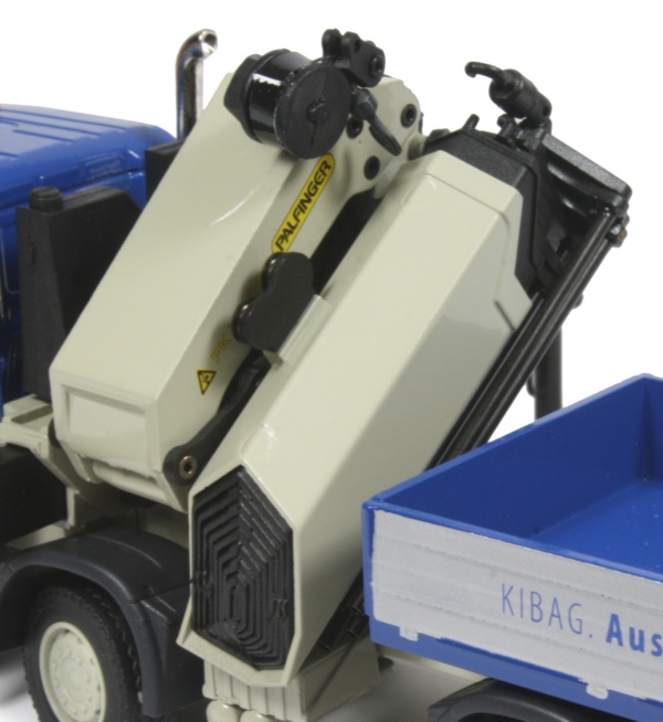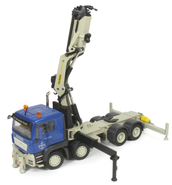 Presented here is the 1:50th scale MAN TGS LX 4-axle truck with Palfinger PK100002-SH knuckle boom crane in the Kibag company livery. the model is produced by Conrad and is exclusive to Heavy Transport Models. It is obvious that Conrad have put a lot of effort into the model to capture all the functional details of the full sized Palfinger crane which is testament to the engineering excellence. While the crane does look a touch overscale, this is not really noticed when considering all the functional aspects of the crane. Great touches include the fixed and winch mounted hooks that can be connected to the two outermost boom sections. The heavy weight and feel of the model is typically Conrad with accurate and smooth movement of the boom hydraulics.