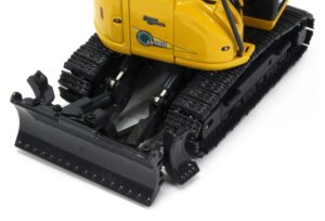 The track frames are fitted with rotating metal track pads which have captured the rounded ends of each pad to mimic the real machine. This gives the tracks an interesting look with the idler wheels tensioned to keep the tracks taut. The blade design has been replicated to allow the angle to be adjusted, while the frame has plenty of height adjustment with dimples along the lower edge mimicing the fixing bolts for the blade's cutting edge.