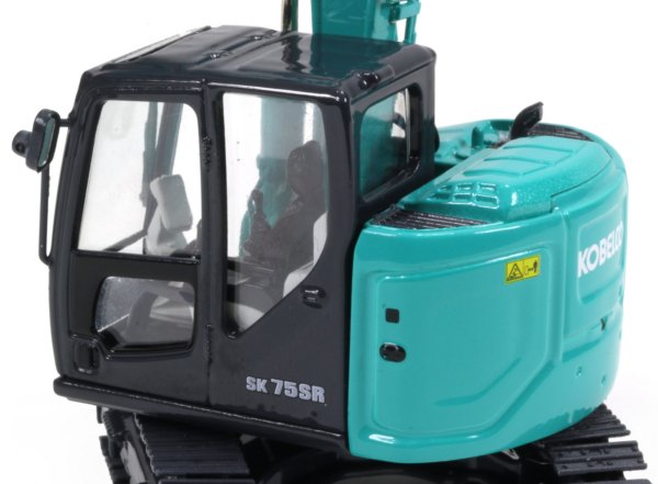Kobelco SK75SR-7 Tracked ExcavatorPresented here is the Kobelco SK75SR-7 tracked excavator, a mid-range excavator tipping the scales between 8 and 9 ton depending on configuration. It is powered by a stage V compliant Yanmar 4TNV98CT diesel engine and has an increased digging force, faster cycle time and improved arm digging speed over its predecessor. The full-sized cabin with redesigned interior and air suspension seat offers increased operator comfort. It is no surprise that a replica of the SK75SR-7 has been produced to coincide with the launch and it is the smallest Kobelco model to be produced in 1:50th scale. The model has been produced by Motorart and follows the same levels of detail and functionality as their other recent releases. The small dimensions of the digging equipment have been nicely engineered to add as much functionality and detail as possible, including the network of hydraulic lines that travel along the back of the boom, with silver coloured flexible lines connecting to the bucket cylinder and auxiliary circuit representing armoured lines. All pin heads and rivets have been painted over and the range of movement is very impressive. The compact shape of the body has been captured well, with surface engraving used to highlight the panel lines and handles while the upper grill has a slotted texture.