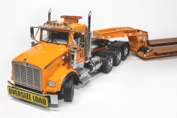 The large and distinctive bonnet houses a large photo-etched front grill with prominent Kenworth logo located centrally and a large chromed bumper which has a hole cut in the center where the collector can choose to connect either the wide load warning panel or a pintle hitch.